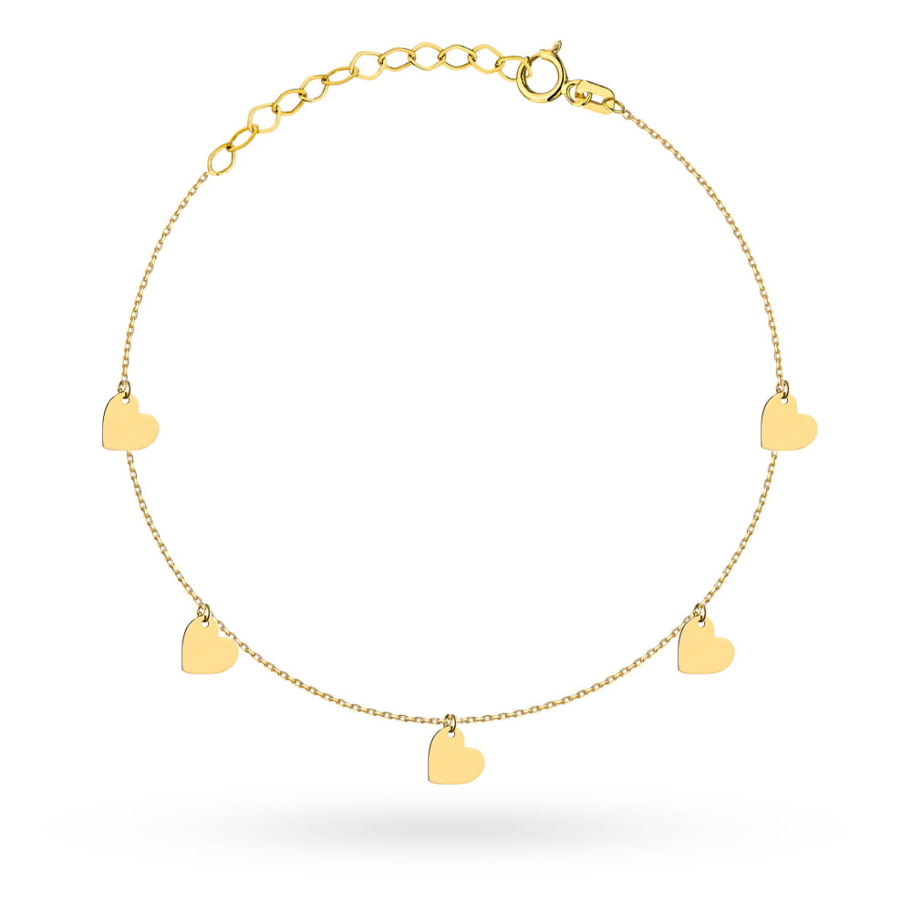 Bransoletka pięć pełnych złotych serduszek na nogę