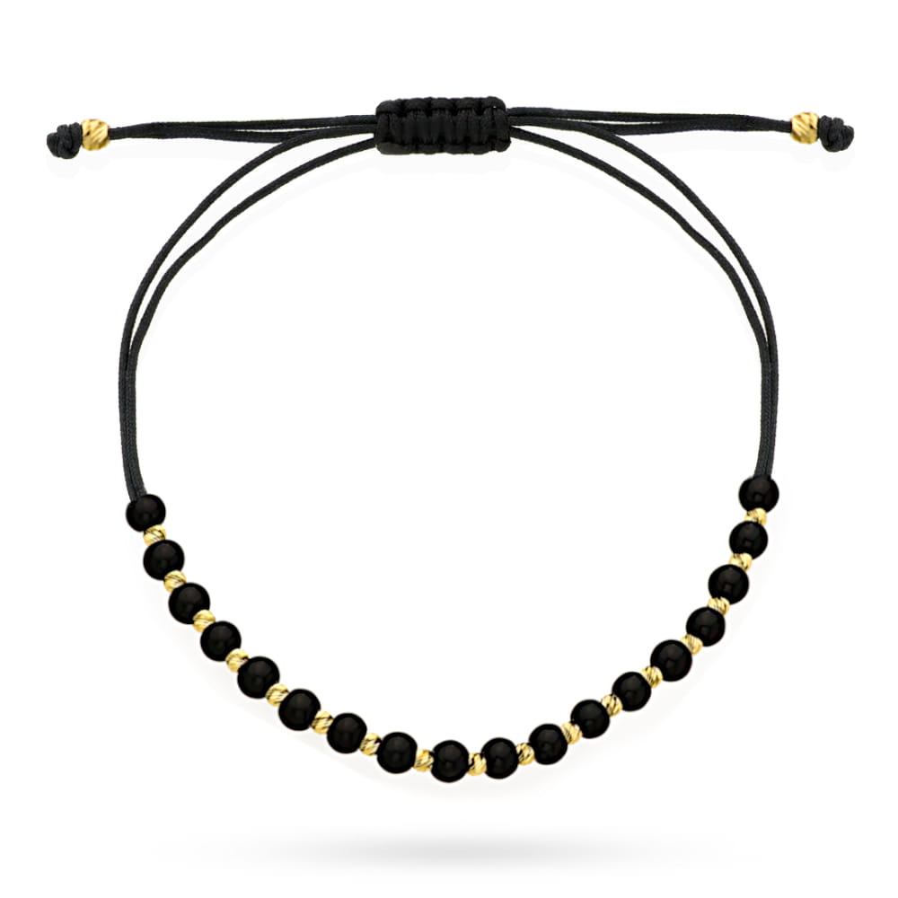 Precyzyjnie wykonana złota celebrytka bransoletka próby 585. Modne czarne kamienie przeplatane złotymi diamentowanymi kulkami na czarnym sznurku. Płacisz jedynie za złoto.