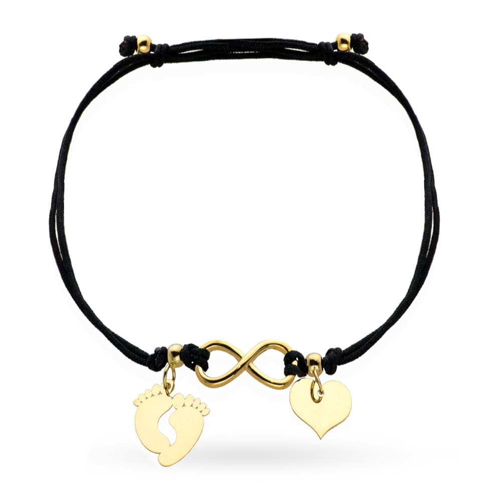 Bransoletka stópki nieskończoność i serce na czarnym sznurku