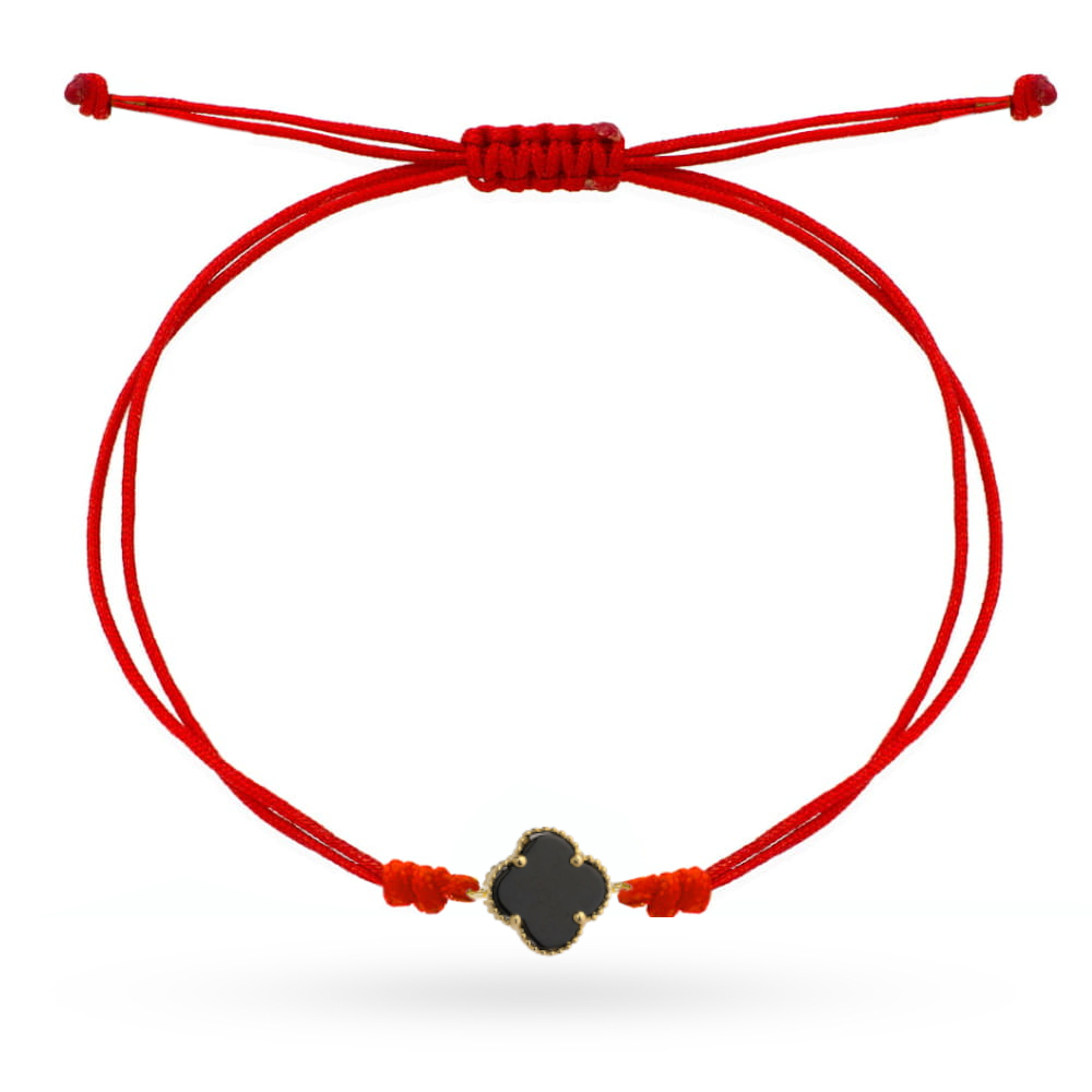 Bransoletka złota czarna koniczynka na czerwonym sznurku