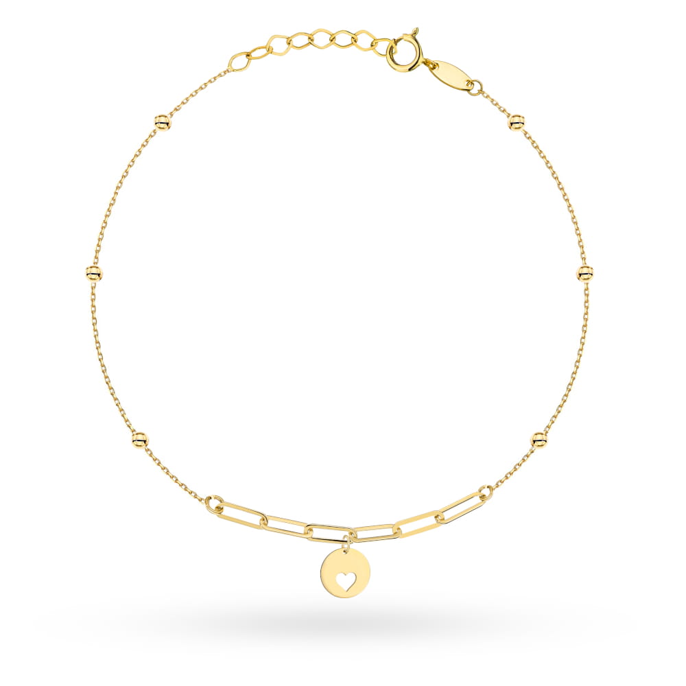 Bransoletka złota z gładkimi kulkami, ogniwami i wiszącym kółkiem z sercem