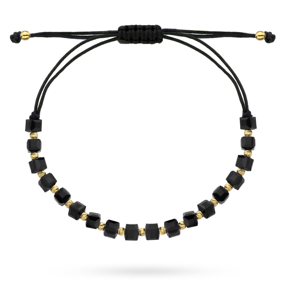 Precyzyjnie wykonana złota celebrytka bransoletka próby 585. Modne czarne kamienie przeplatane złotymi diamentowanymi kulkami na czarnym sznurku. Płacisz jedynie za złoto.
