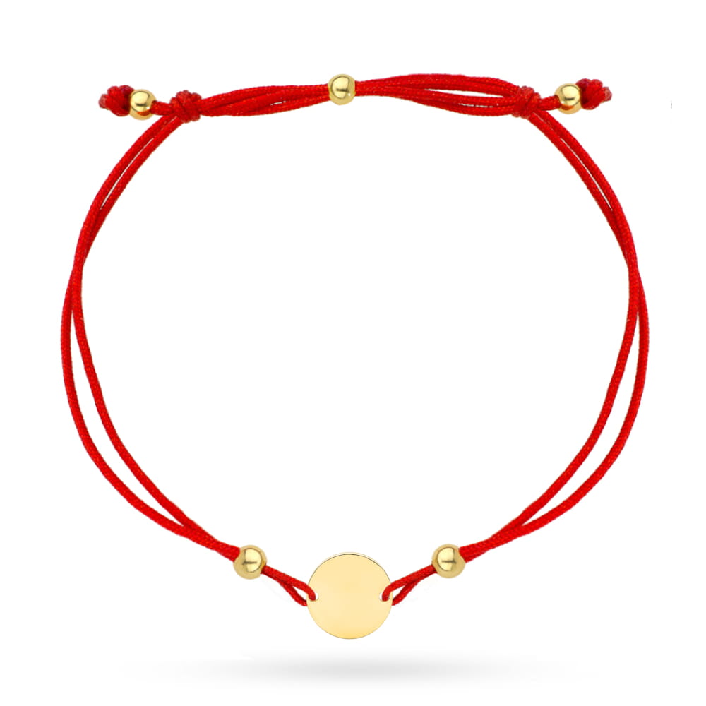 Modna i stylowa złota bransoletka próby 585 na czerwonym sznurku.