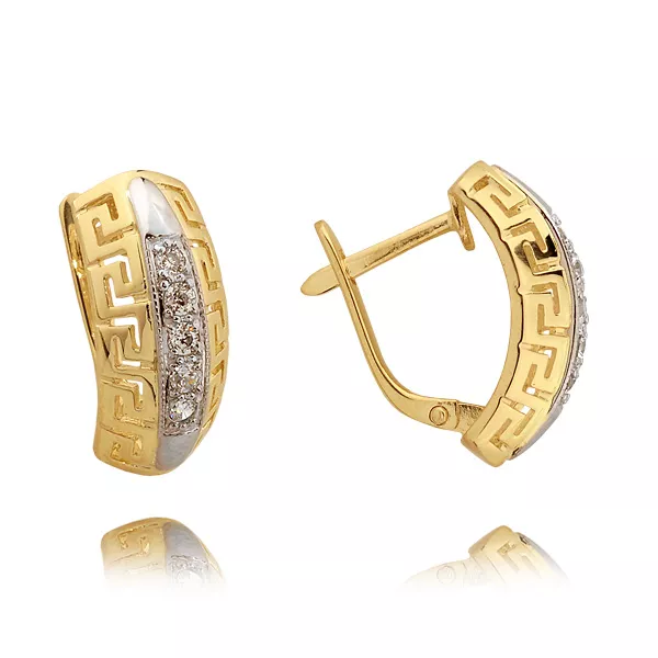 Kolczyki wykonane ze złota próby 0,333 lub 0,585 w kolorze żółtym, białym lub różowym. Ozdobione kamieniami naturalnymi lub laboratoryjnymi, takimi jak diamenty, cyrkonie lub kamienie barwne. Staranna oprawa zapewnia trwałość oraz piękny połysk przez lata. Doskonały wybór na prezent lub do własnej kolekcji.