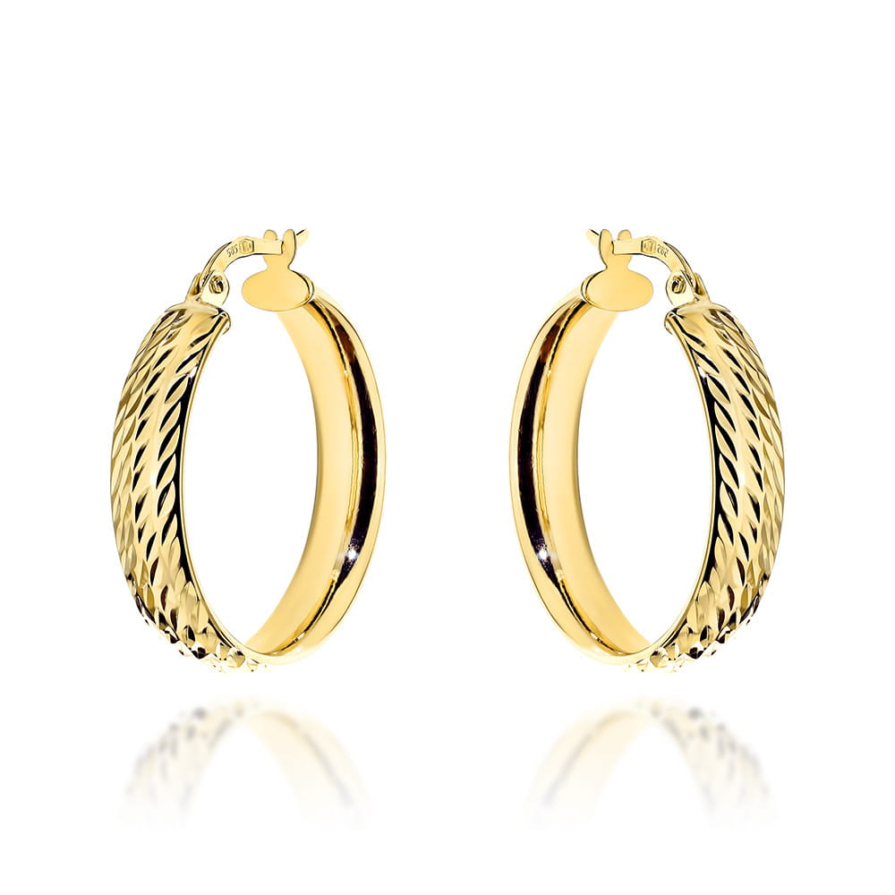 Precyzyjnie wykonane złote kolczyki koła zdobione diamentowaniem próby 585. Doskonałe jako prezent na imieniny, ważny jubileusz ozdoba eleganckiej kreacji.