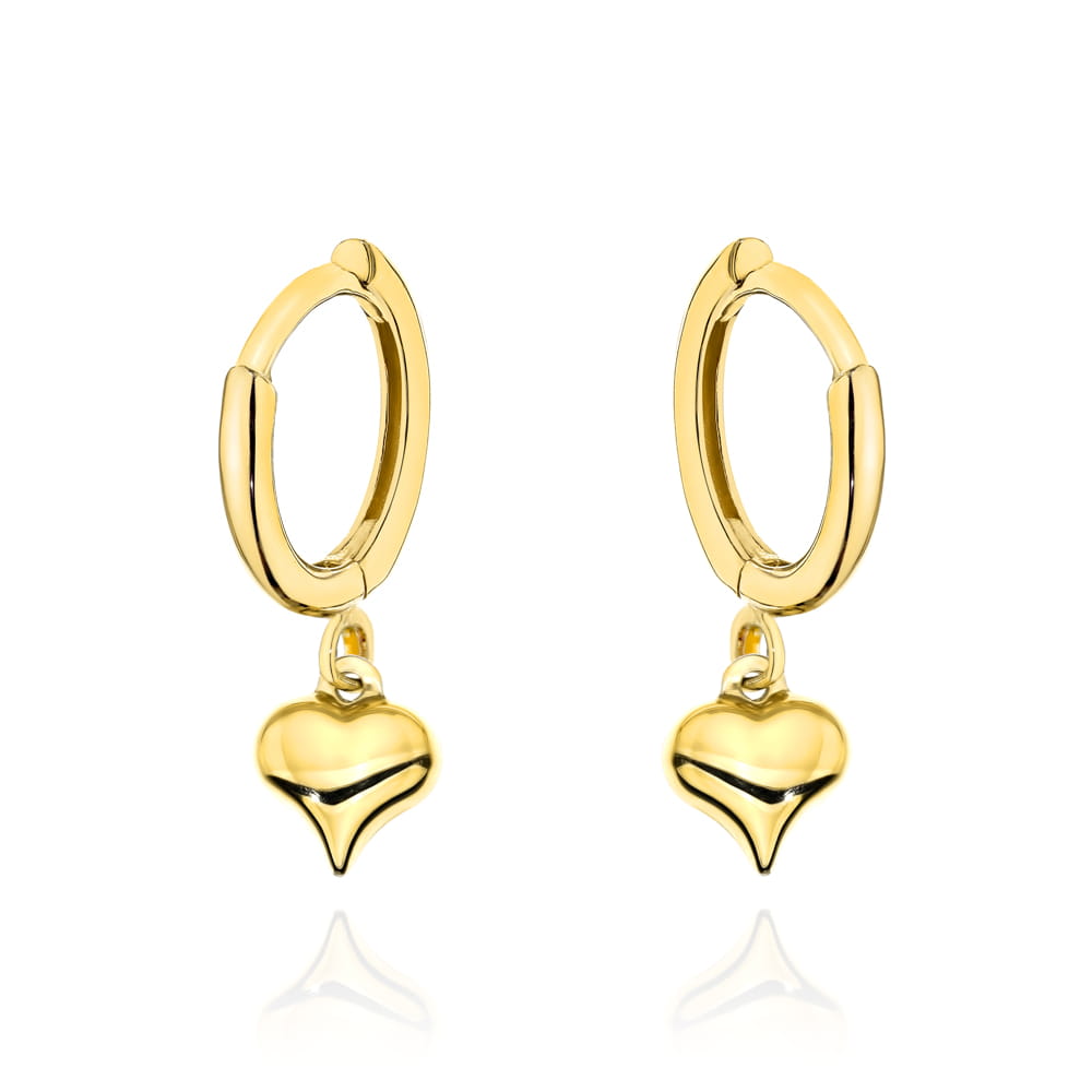 Precyzyjnie wykonane złote kolczyki próby 585 z wiszącym sercem, diamentowanym przodem i gładkim tyłem.