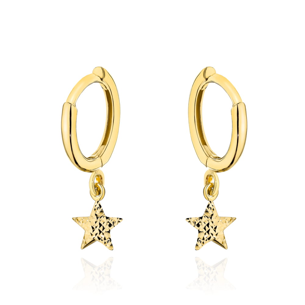 Precyzyjnie wykonane złote kolczyki próby 585 z wiszącą gwiazdką z przodu diamentowaną i gładkim tyłem.