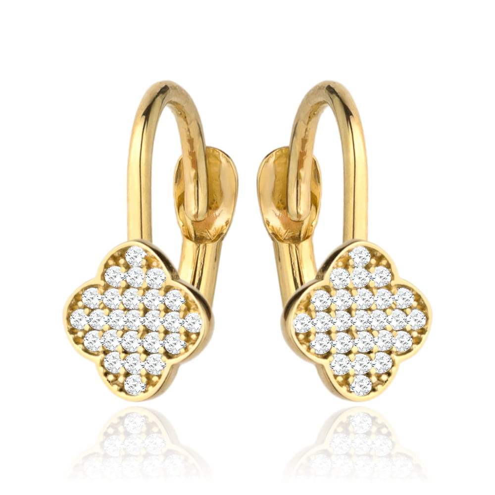 Kolczyki złote koniczynki wysadzane cyrkoniami na angielskim zapięciu