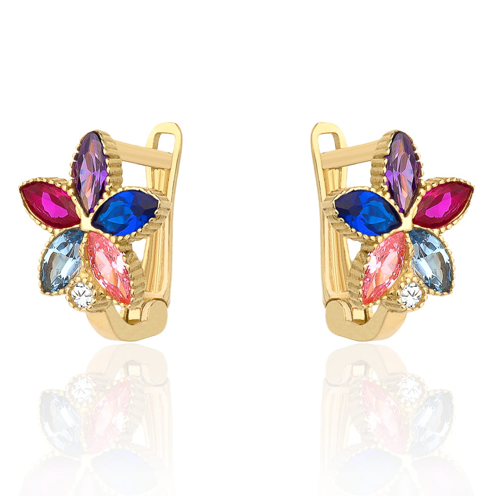 Precyzyjnie wykonane złote dziecięce kolczyki próby 585 z kolorowymi kamieniami. Doskonałe na prezent na dzień matki, imieniny, ważny jubileusz, ozdoba eleganckiej kreacji.