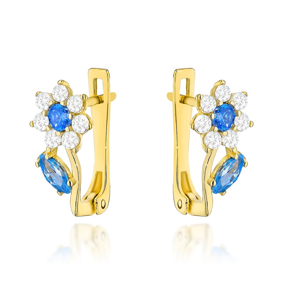 Kolczyki złote kwiatki z niebieskimi cyrkoniami