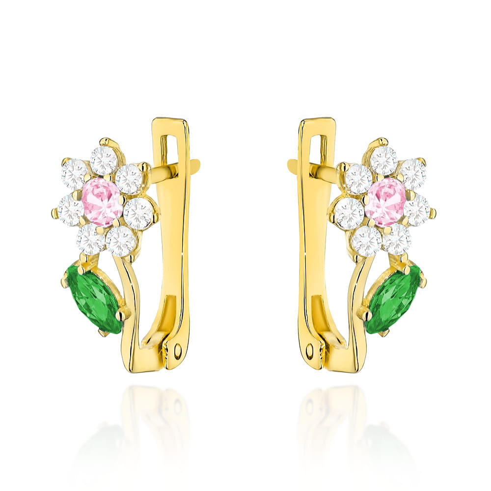 Kolczyki złote kwiatki z różową i zieloną cyrkonią