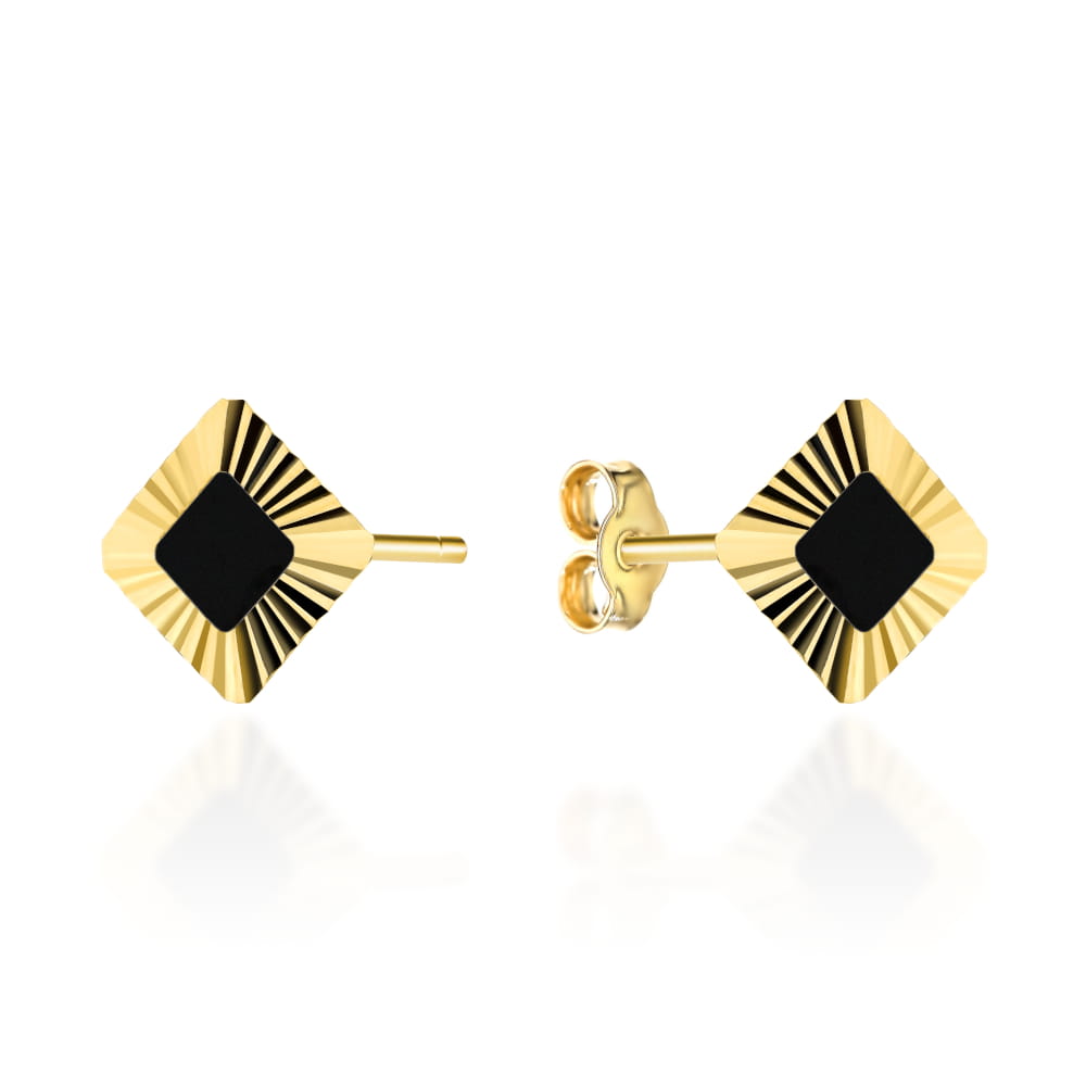 Kolczyki złote romby z czarnym kamieniem w diamentowanej oprawie