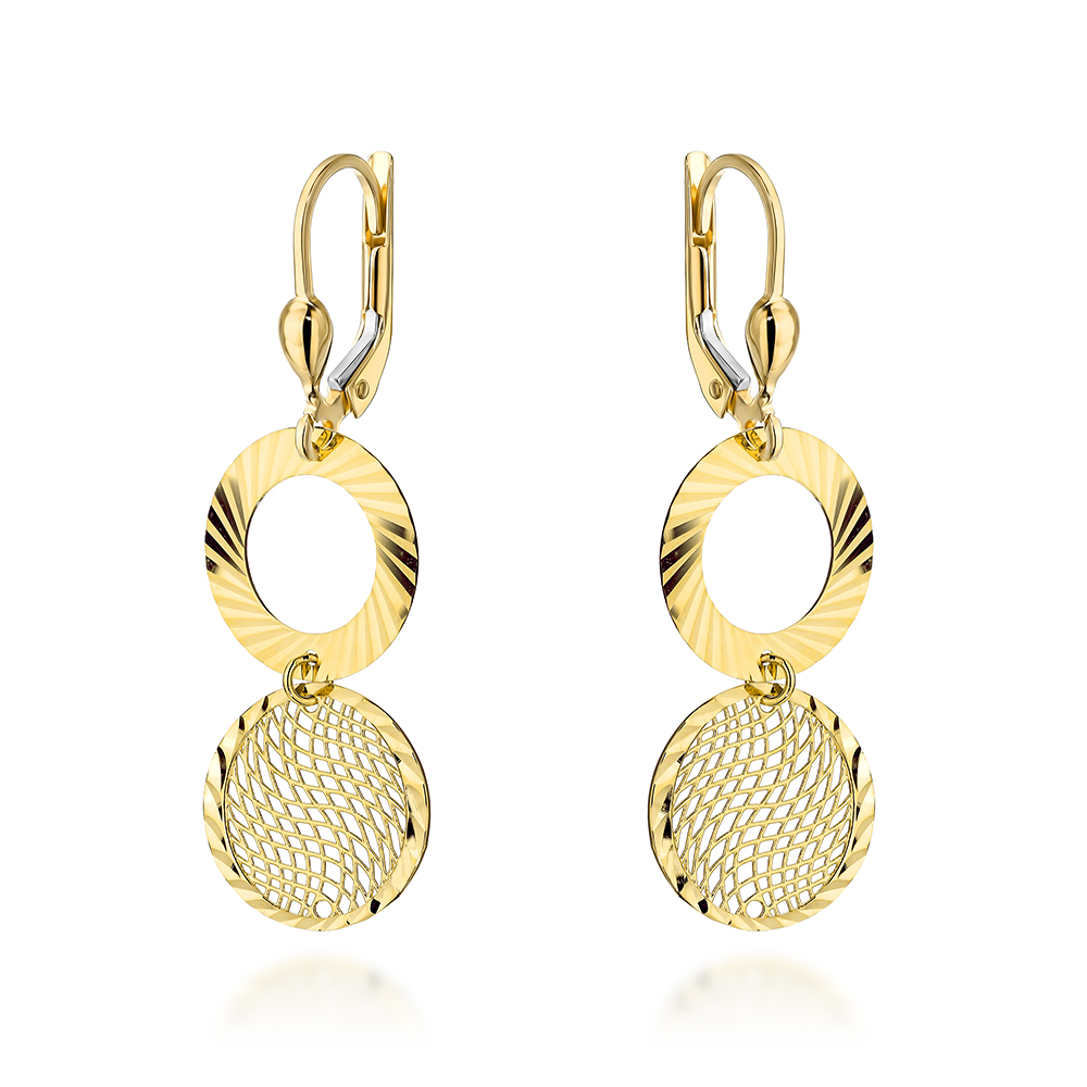 Kolczyki złote wiszące diamentowany ring i ażurowe kółko