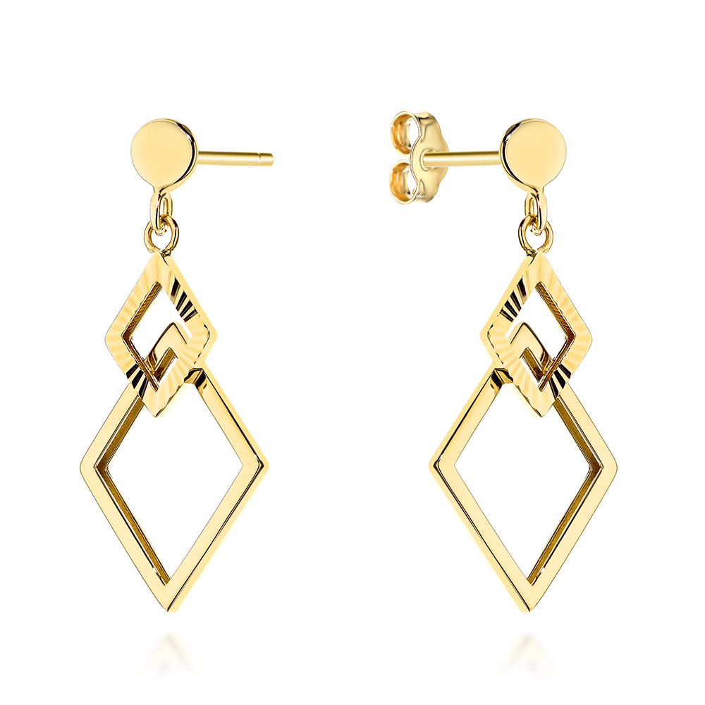 Kolczyki złote wiszące romby zdobione diamentowaniem