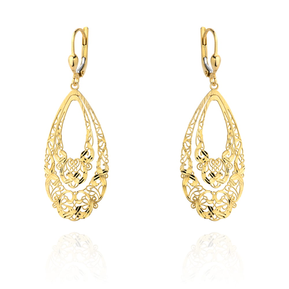 Precyzyjnie wykonane złote kolczyki próby 585. Doskonałe jako prezent na imieniny ważny jubileusz ozdoba eleganckiej kreacji.