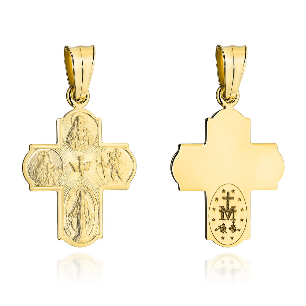 Precyzyjnie wykonany złoty krzyżyk próby 585. Przedstawia cztery wizerunki : Serce Jezusa Chrystusa, Św. Krzysztofa, Cudowny Medalik, Matka Boska Z Dzieciątkiem oraz po środku Ducha Świętego. Pamiątka chrztu, pierwszej komunii, bierzmowania lub ważnego jubileuszu.