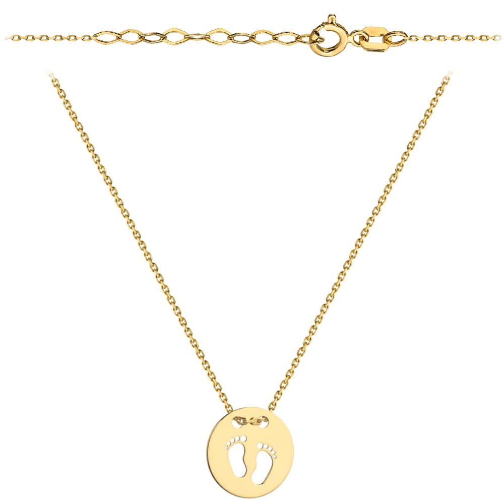 Precyzyjnie wykonany złoty naszyjnik próby 585. Łańcuszek z modnym elementem. Doskonały prezent z okazji Baby Shower oraz jako pamiątka chrztu.