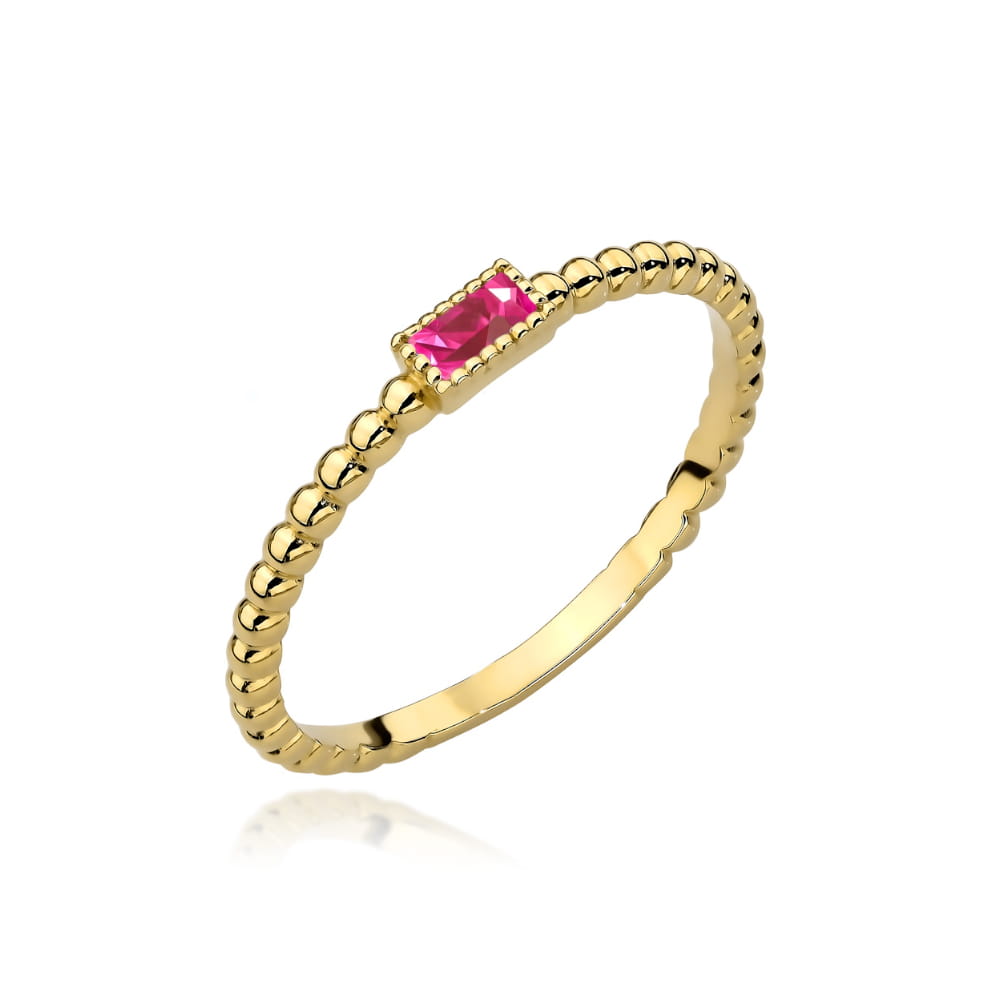 Pierścionek złote kulki i prostokątny kamień w kolorze fuksji