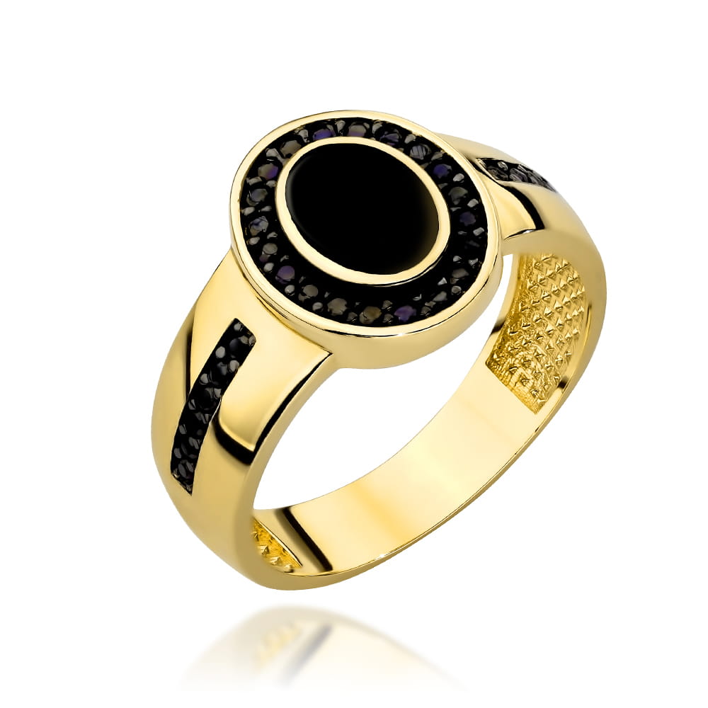 Pierścionek złoty owal z emalią zdobiony czarnymi kamieniami
