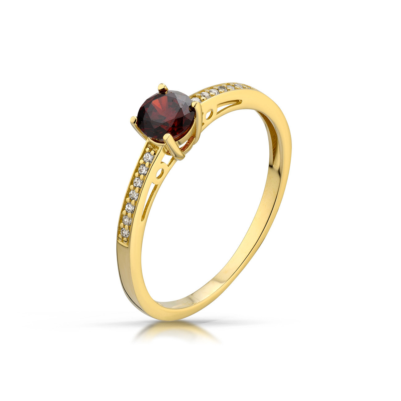 Elegancki pierścionek wykonany z wysokiej jakości złota. W zależności od modelu może zawierać szafiry, rubiny, szmaragdy, tanzanity, granaty lub inne kamienie kolorowe. Uniwersalna forma sprawia, że biżuteria pasuje do każdej stylizacji.