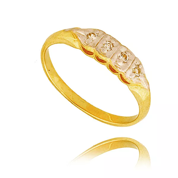 Stylowy pierścionek będący doskonałym wyborem dla osób ceniących jakość i estetykę. Subtelny połysk kamieni pięknie współgra z kolorem złota.