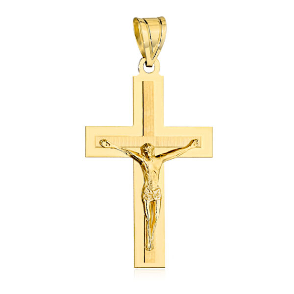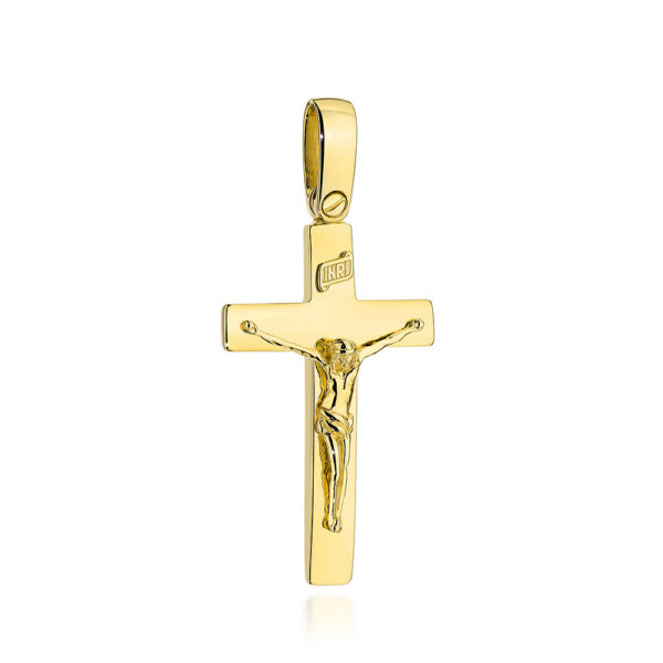 Krzyżyk złoty błyszczący z oprawą z ukrzyżowanym Jezusem